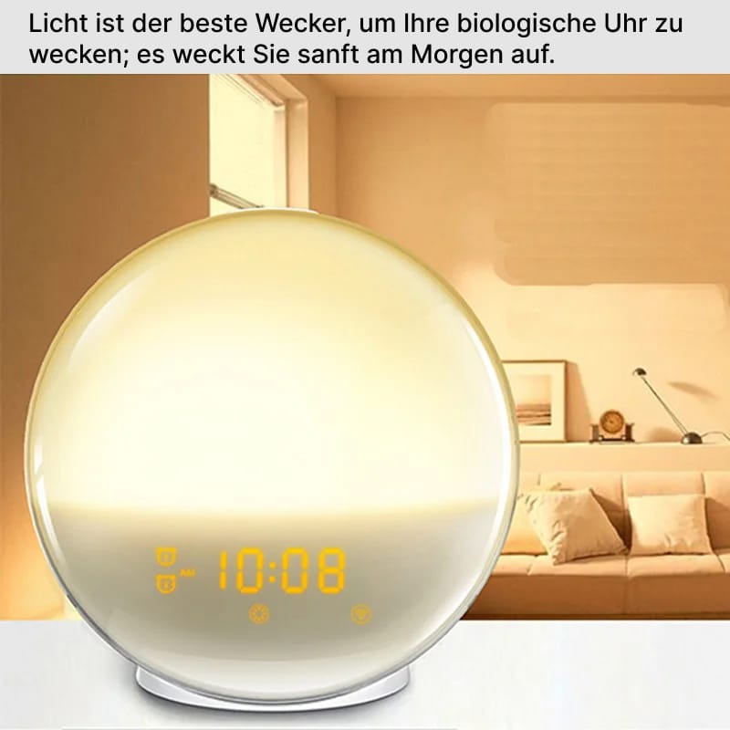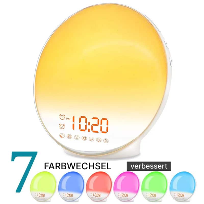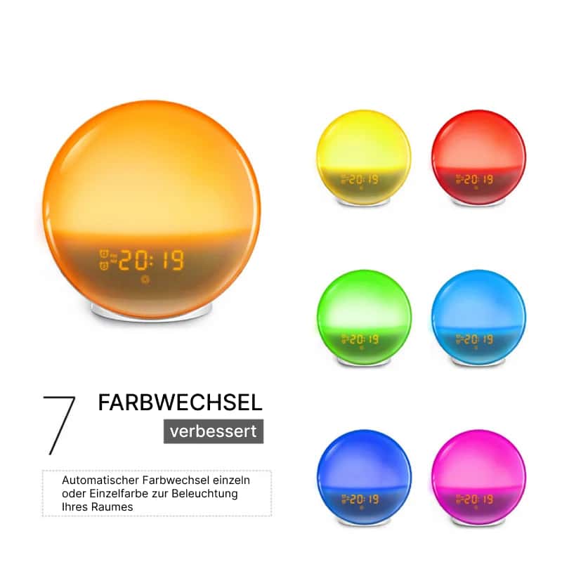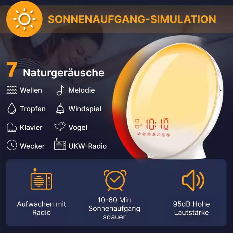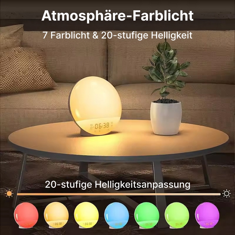 Die Sonnenaufgangssimulation beginnt 10 bis 30 Minuten vor Ihrer Weckzeit und steigert die Helligkeit graduell von 10% auf 100%. Das Licht wechselt dabei von sanftem Rot über Orange zu hellem Tageslicht.