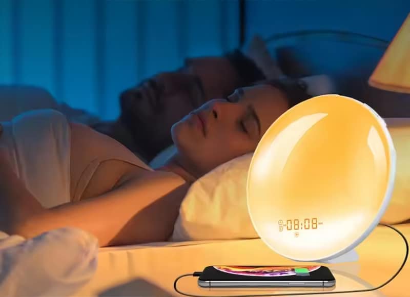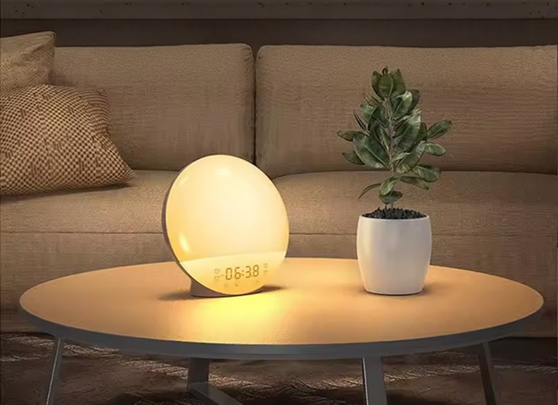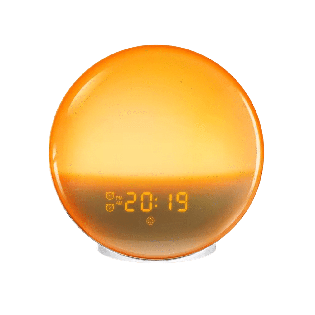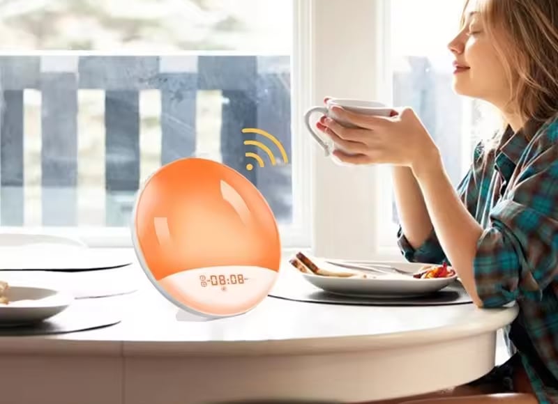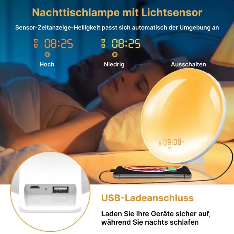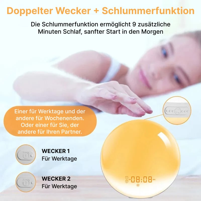 Die Sonnenaufgangssimulation beginnt 10 bis 30 Minuten vor Ihrer Weckzeit und steigert die Helligkeit graduell von 10% auf 100%. Das Licht wechselt dabei von sanftem Rot über Orange zu hellem Tageslicht.