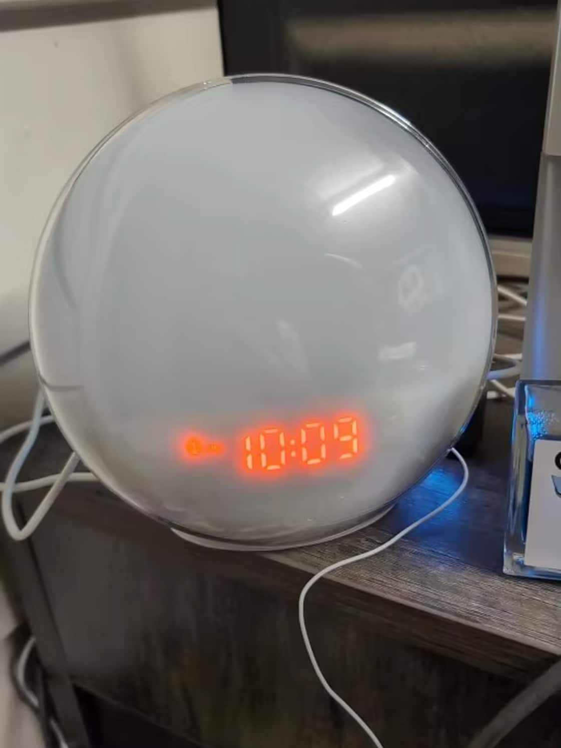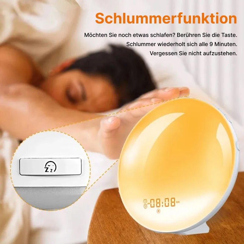 Die Snooze-Funktion gewährt Ihnen bis zu fünfmal zusätzliche neun Minuten Schlaf. Drücken Sie einfach die Snooze-Taste oben am EosNiva Sunrise Alarm Clock.