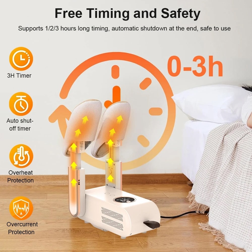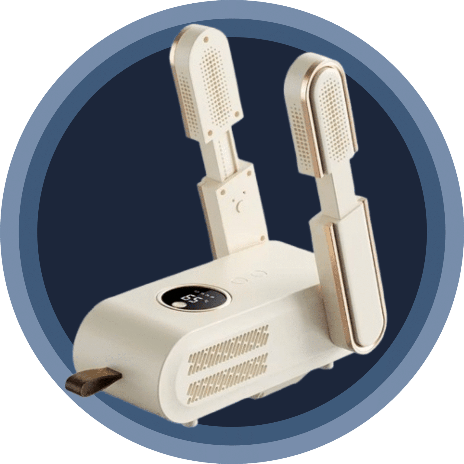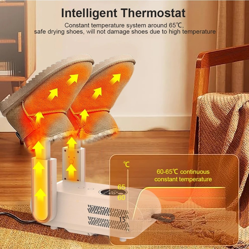 Die Trocknungszeit hängt vom Feuchtigkeitsgrad ab. Leicht feuchte Schuhe sind in 15-20 Minuten trocken, stark durchnässte Schuhe benötigen 30-45 Minuten für optimale Ergebnisse.