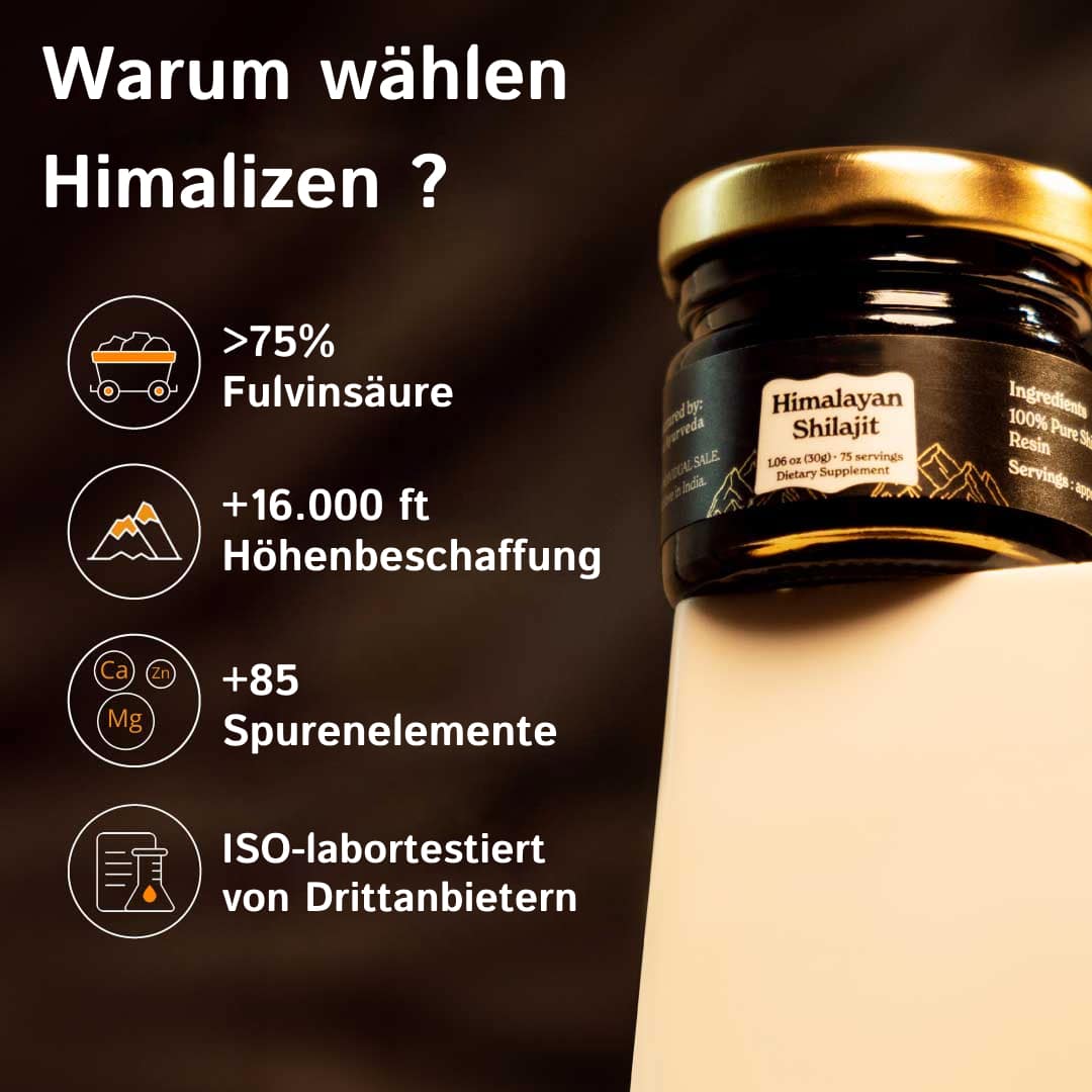 Himalizen Shilajit zeichnet sich durch besonders hohe Reinheit, traditionelle Gewinnung und nachvollziehbare Herkunft aus den Himalayas aus.