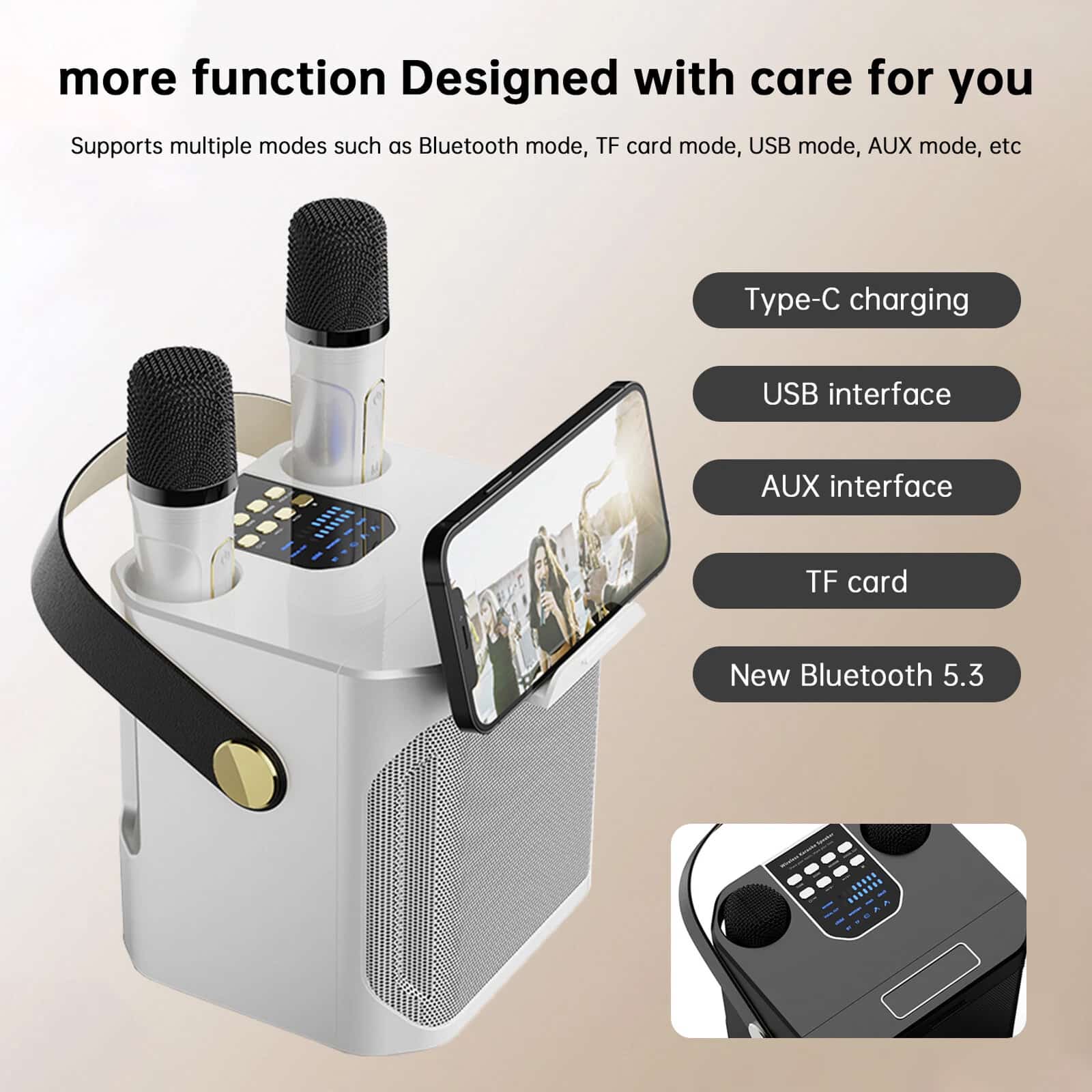Zwei kabellose Mikrofone ermöglichen Duette ohne lästige Kabel. Die stabile Bluetooth 5.3 Verbindung garantiert unterbrechungsfreie Performance mit 10 Meter Reichweite für maximale Bewegungsfreiheit auf der Bühne.