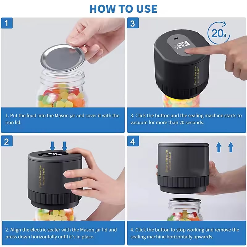 Der LockNJar Vakuumierer funktioniert mit allen strukturierten Standard-Vakuumbeuteln. Sie können auch wiederverwendbare Beutel verwenden für umweltfreundliche Lagerung.
