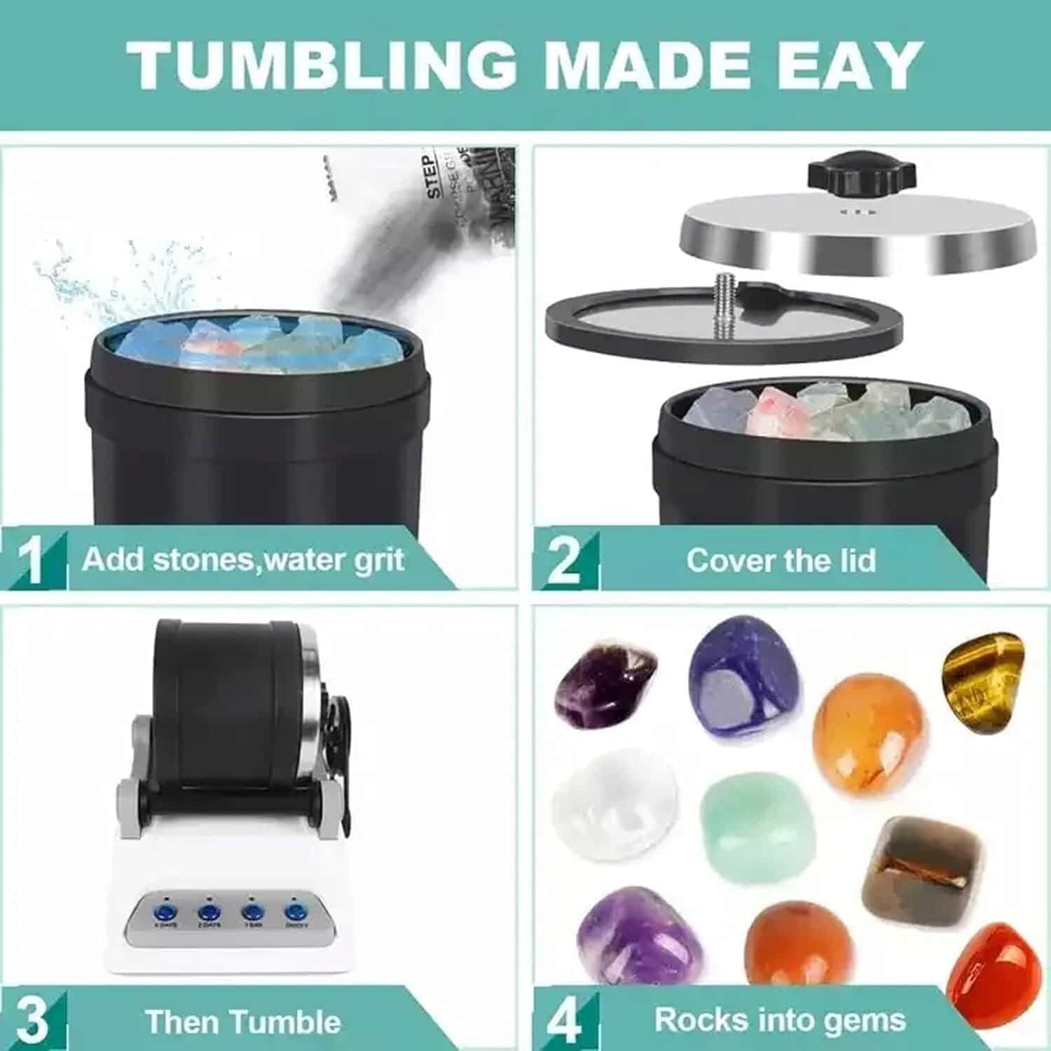 Die LustGemix Steintrommel poliert die meisten Halbedelsteine wie Achat, Jaspis, Quarz und Amethyst. Vermeiden Sie sehr weiche oder sehr harte Mineralien.