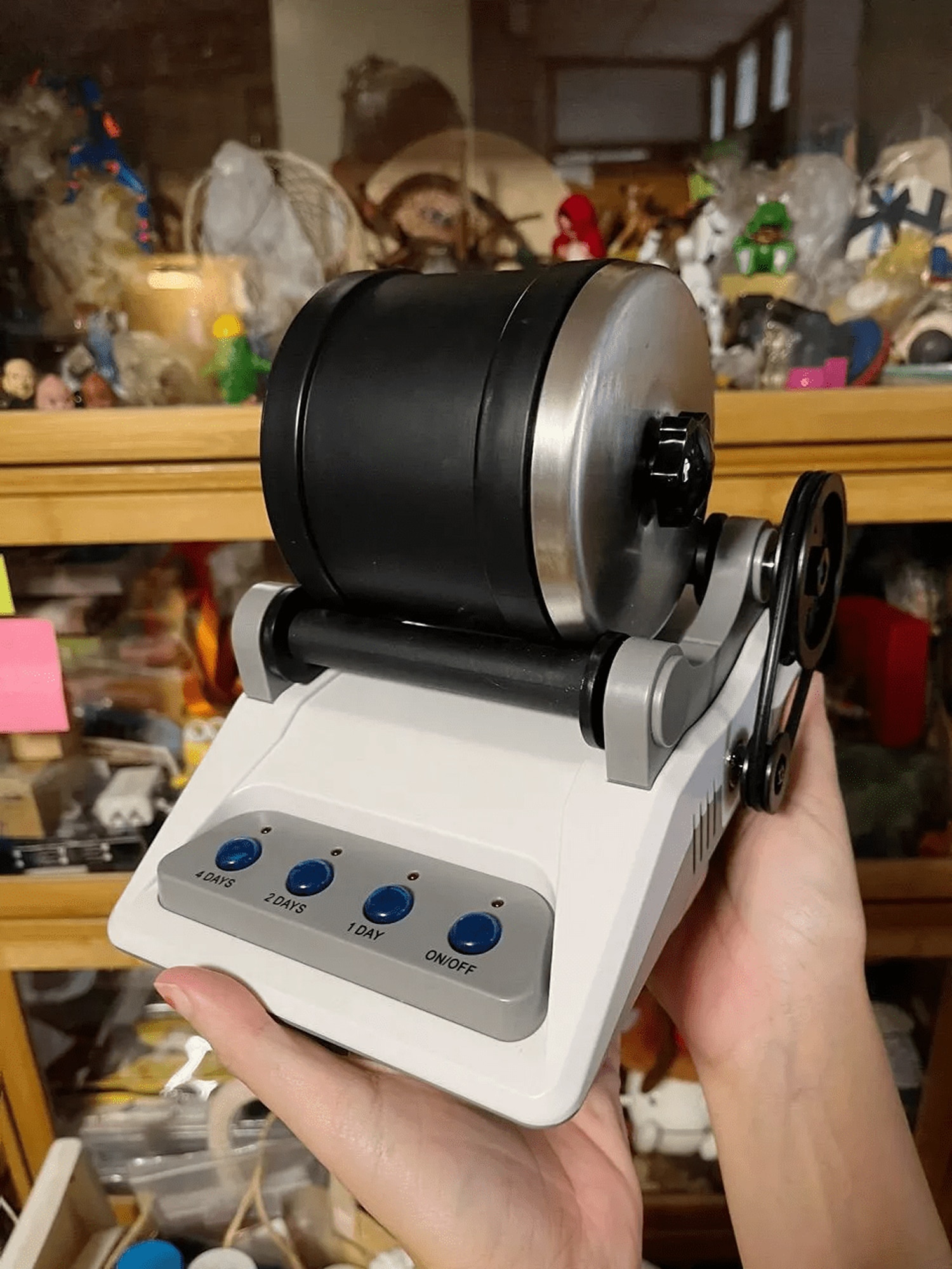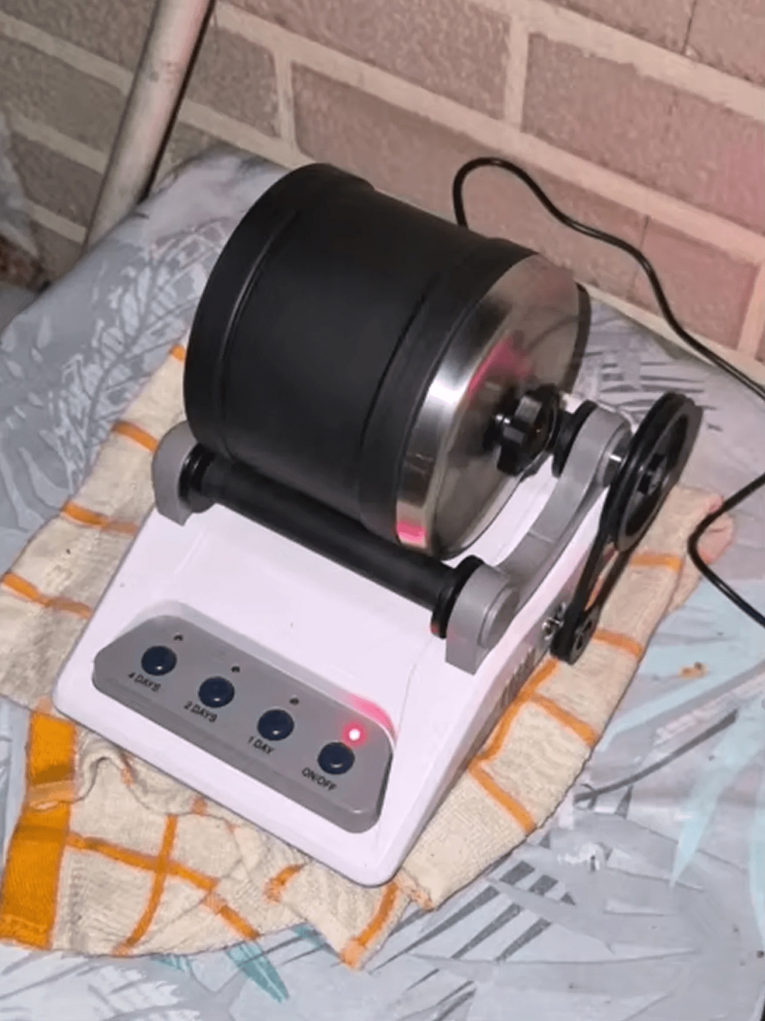 Dank gummierter Auskleidung ist der Betrieb flüsterleise, vergleichbar mit einem leisen Kühlschrank. Sie können die Trommel problemlos über Nacht laufen lassen.