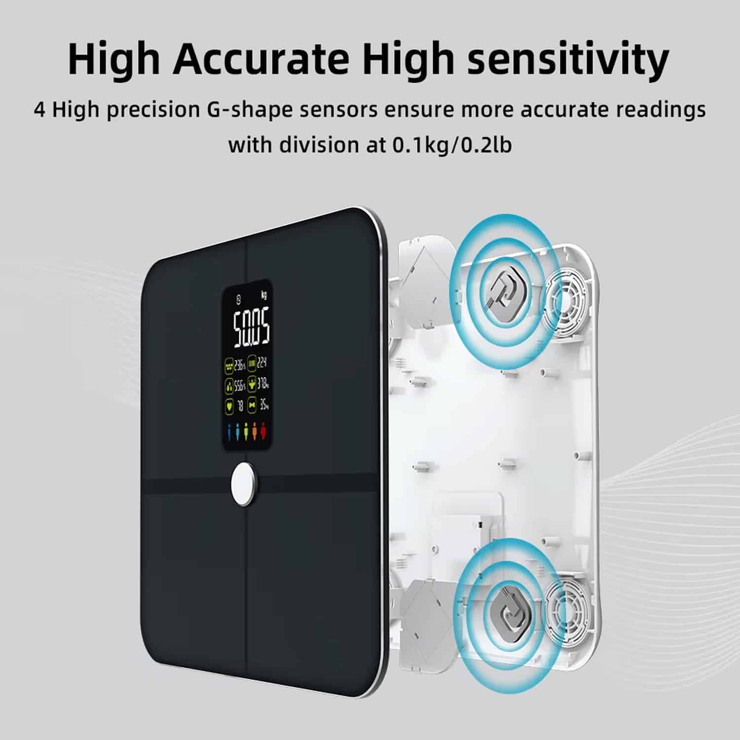 Die ObeSicale Personenwaage nutzt fortschrittliche BIA-Technologie mit vier G-förmigen Sensoren für 0,1 kg Genauigkeit. Sie misst 13 Körperwerte präzise durch elektrische Impedanzanalyse für zuverlässige Gesundheitsdaten.
