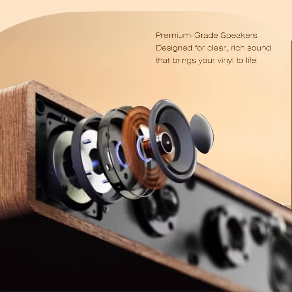 Hochwertige Lautsprecher liefern kristallklare Höhen, tiefe Bässe und perfekte Klarheit, die Ihre Vinyl-Sammlung mit außergewöhnlicher Fülle und Wärme zum Leben erwecken.