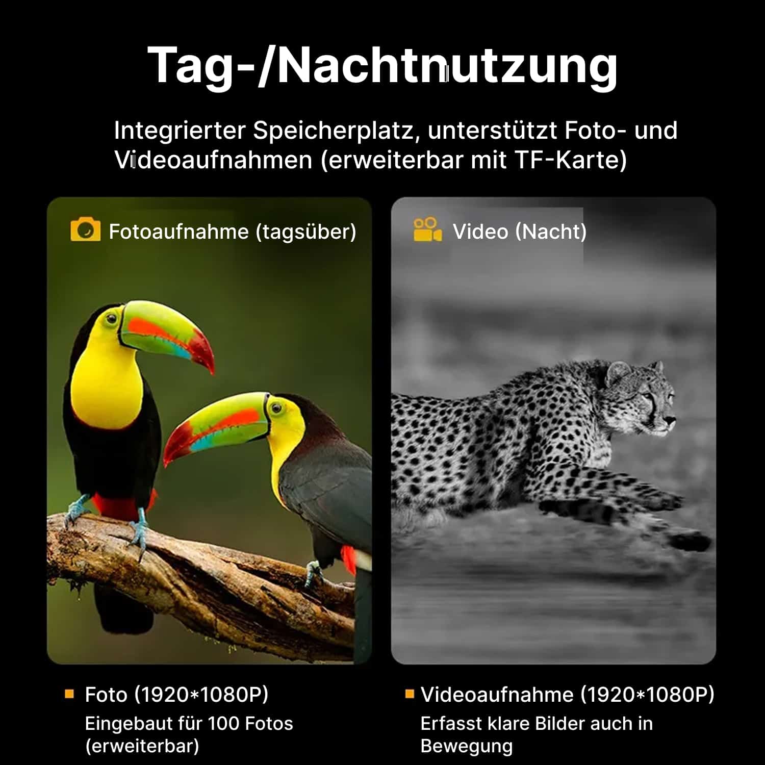 Die integrierte Ultra HD 1080P Aufnahmefunktion dokumentiert jeden wichtigen Moment in gestochen scharfer Qualität. Halten Sie unvergessliche Naturerlebnisse fest und teilen Sie beeindruckende Aufnahmen mit Familie und Freunden.