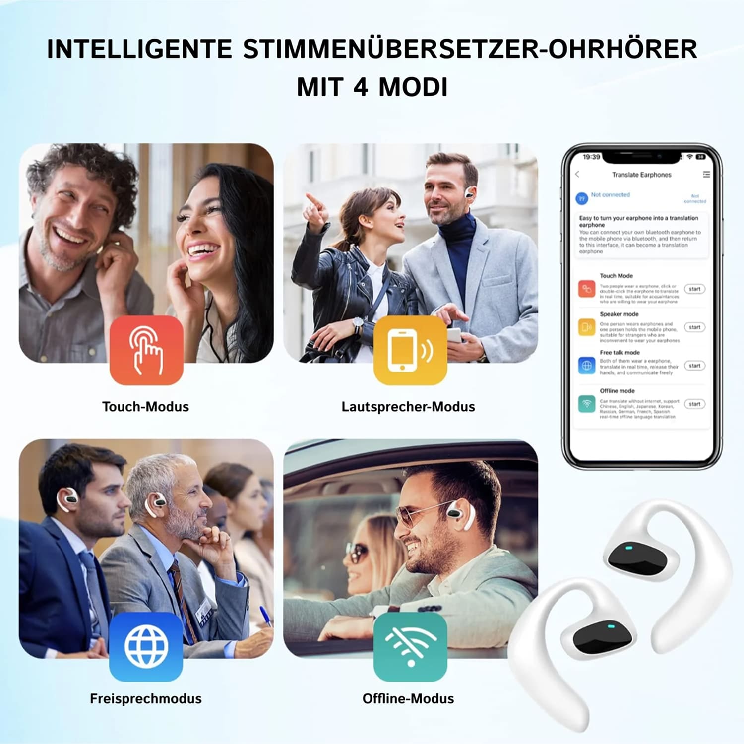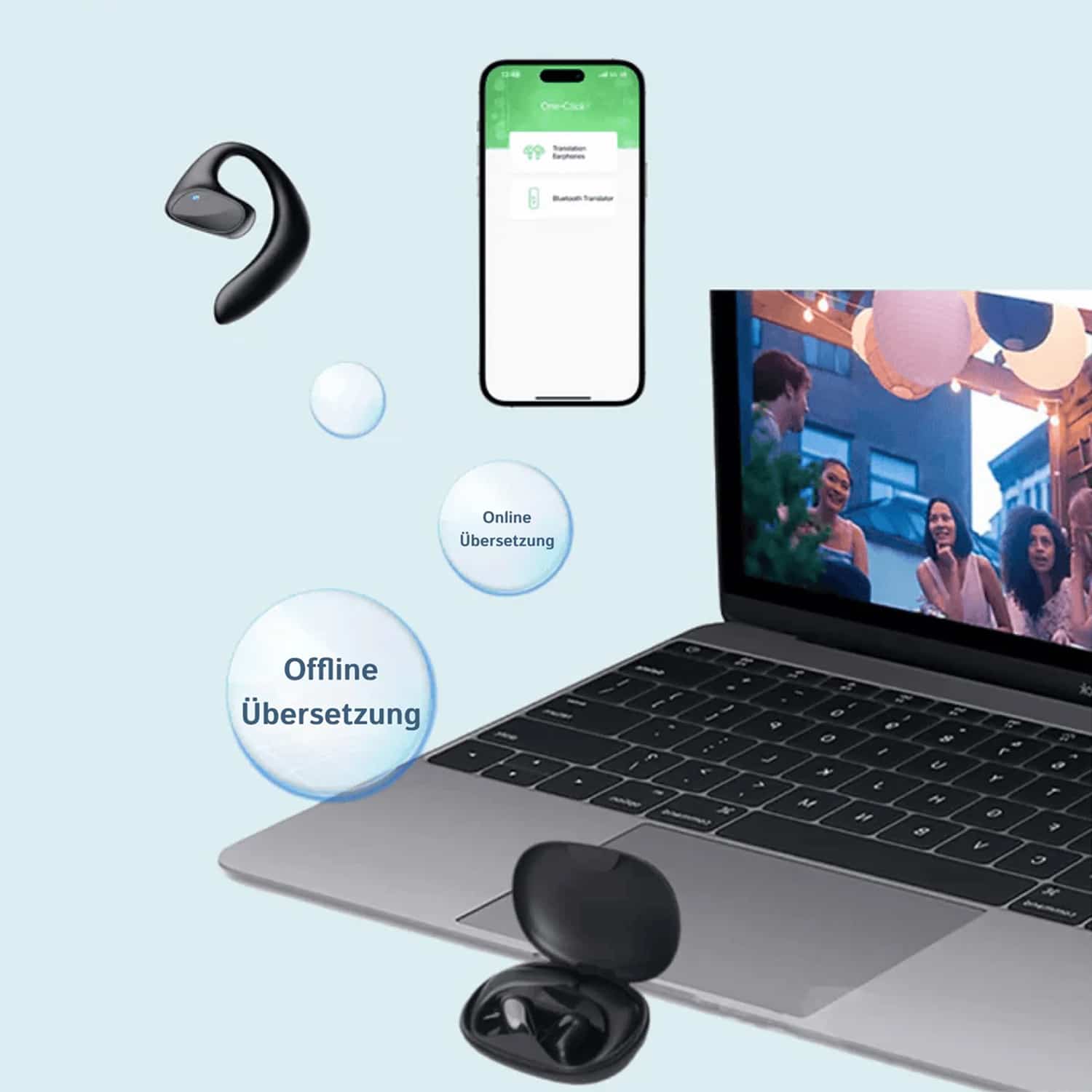 Für die volle Funktionalität der Talkbuddz Ohrhörer ist eine Bluetooth-Verbindung zu Ihrem Smartphone mit Internetzugang erforderlich, da die KI-Übersetzung in der Cloud erfolgt für maximale Genauigkeit und Aktualität.