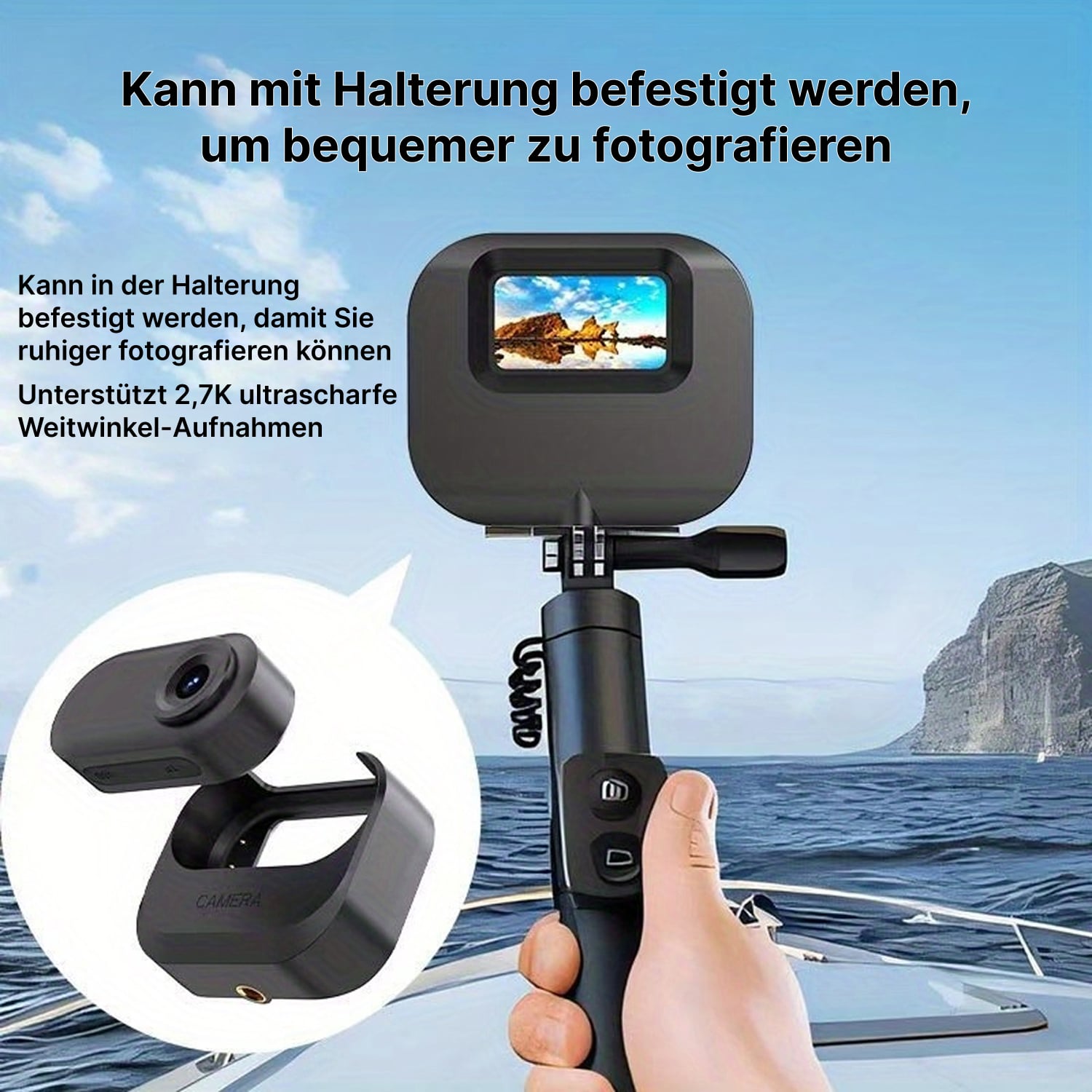 Die UnHadycam verfügt über eine spritzwassergeschützte Bauweise, die leichten Regen und Spritzwasser standhält. Für starken Regen empfehlen wir jedoch zusätzlichen Schutz, da die Kamera nicht vollständig wasserdicht ist.