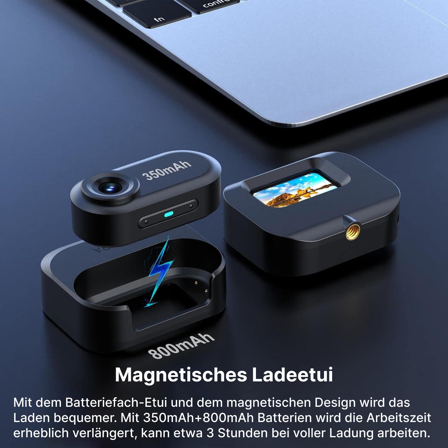 Die volle Aufladung der UnHadycam dauert approximately 2-3 Stunden über USB. Der Akku bietet dann bis zu 5 Stunden ununterbrochene Aufnahmezeit für ausgedehnte Outdoor-Aktivitäten und lange Dokumentationen.